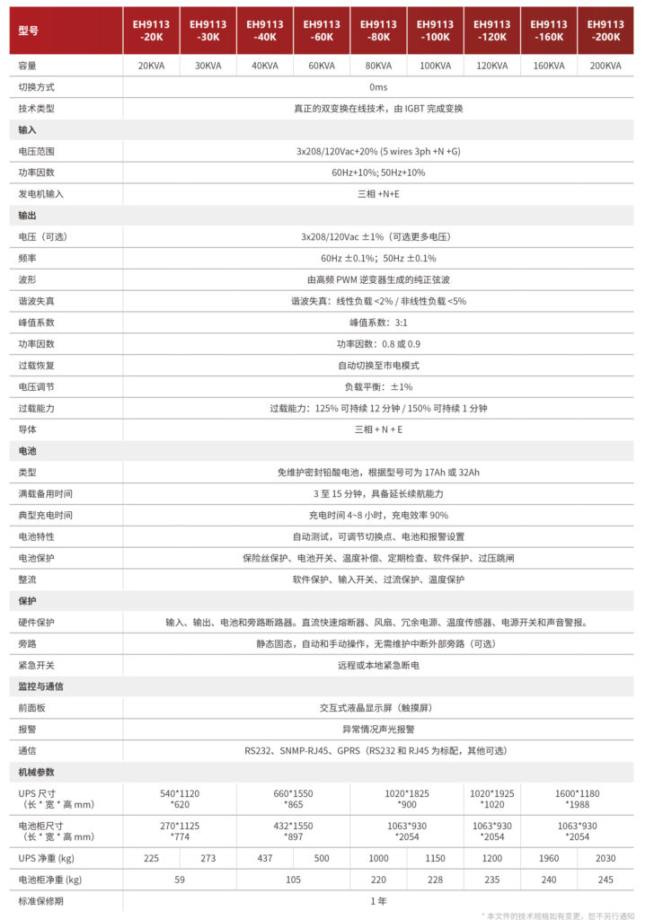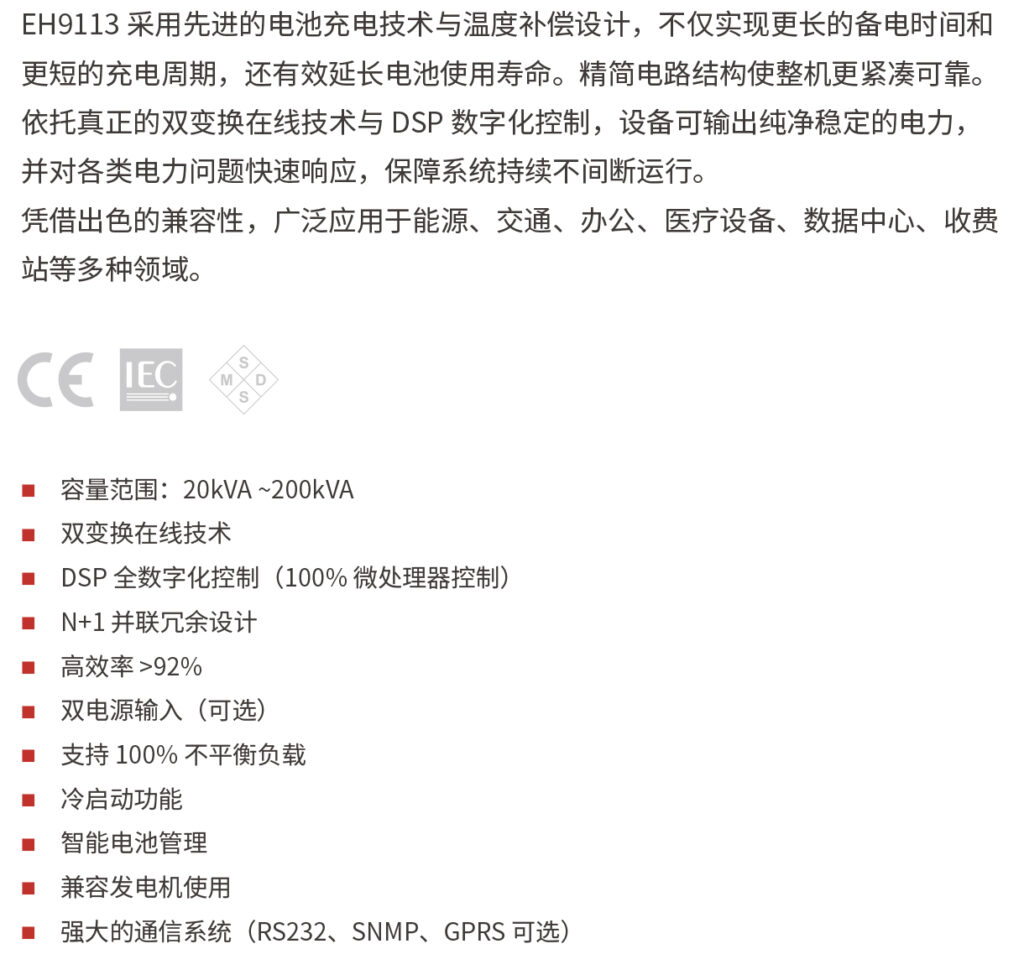EH9113 采用先进的电池充电技术与温度补偿设计,不仅实现更长的备电时间和更短的充电周期,还有效延长电池使用寿命。精简电路结构使整机更紧凑可靠。依托真正的双变换在线技术与 DSP 数字化控制,设备可输出纯净稳定的电力,并对各类电力问题快速响应,保障系统持续不间断运行。