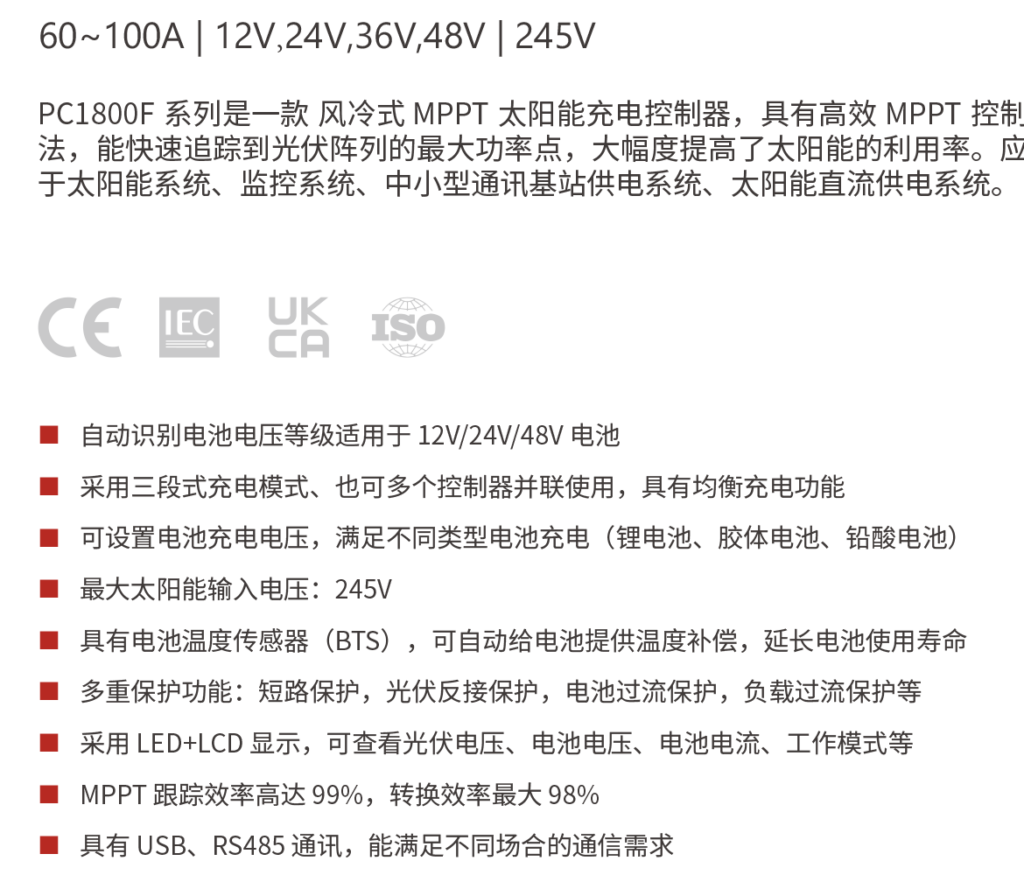 PC1800A 系列是一款自然冷却的的太阳能 MPPT 充电控制器,采用高效的 MPPT算法,能够快速的追踪到光伏阵列的最大功率点。