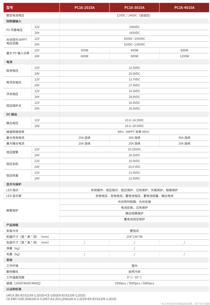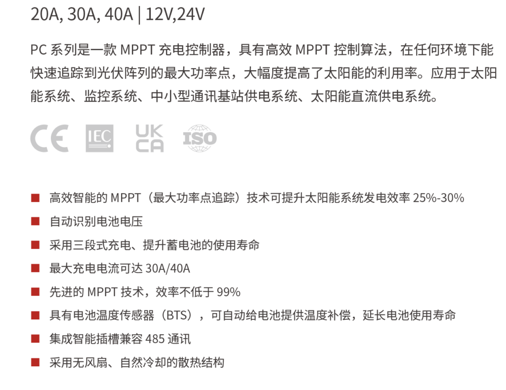 PC系列是一款MPPT充电控制器,具有高效 MPPT控制算法,在任何环境下能快速追踪到光伏阵列的最大功率点,大幅度提高了太阳能的利用率。